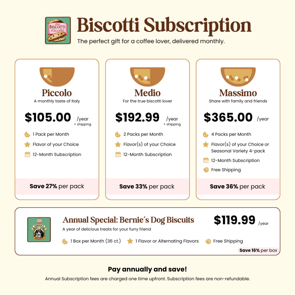 Biscotti Subscriptions Pick your subscription: Subscriptions Massimo: Annual Biscotti Subscription $365.00 Subscriptions Medio: Annual Biscotti Subscription $192.99 Subscriptions Piccolo: Annual Biscotti Subscription $105.00